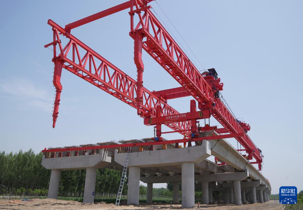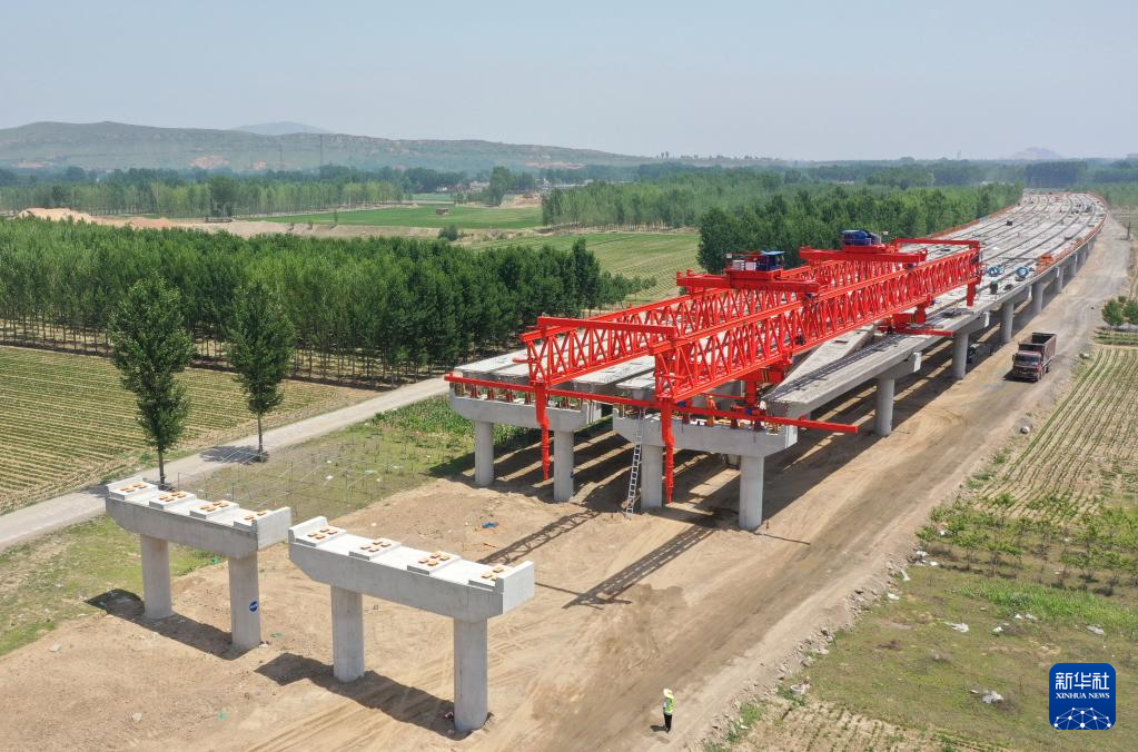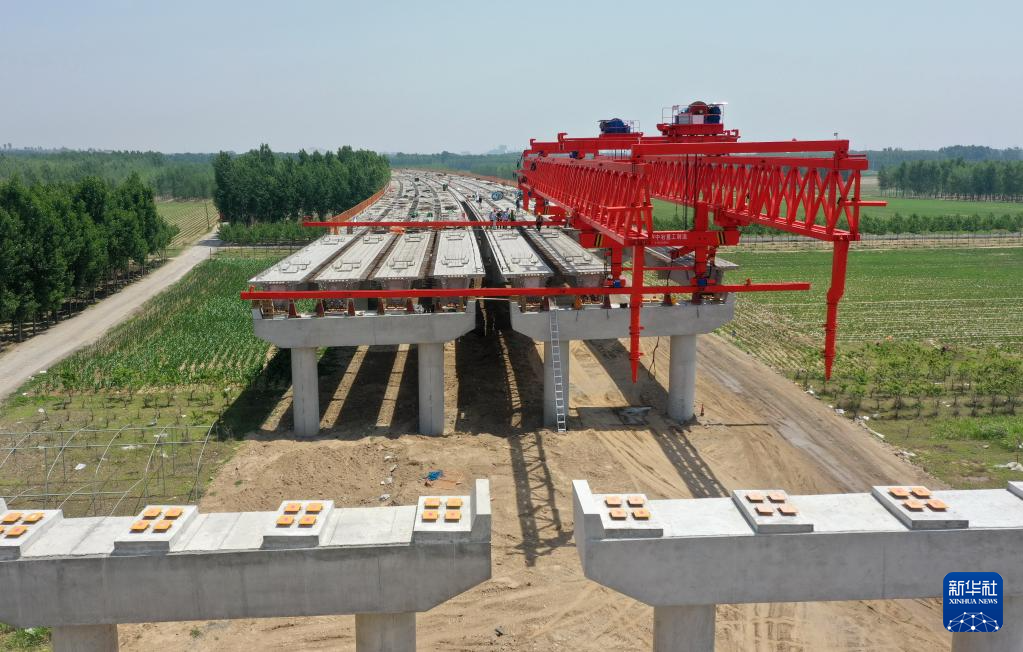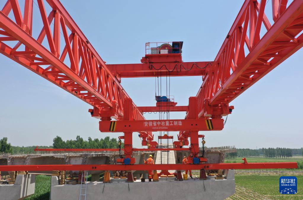 6月8日,工人在河北省昌黎县境内的秦唐高速三标段建设工地吊装预制梁。