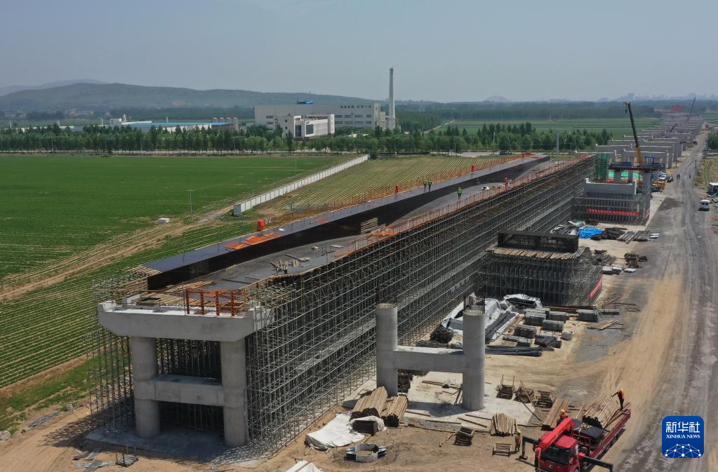 6月8日,工人在河北省昌黎县境内的秦唐高速三标段建设工地施工(无人机照片)。
