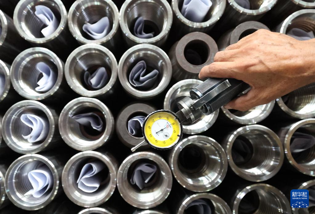 7月3日,在河北省晋州市营里镇一家地质装备生产企业,工人测量钻头螺纹尺寸。