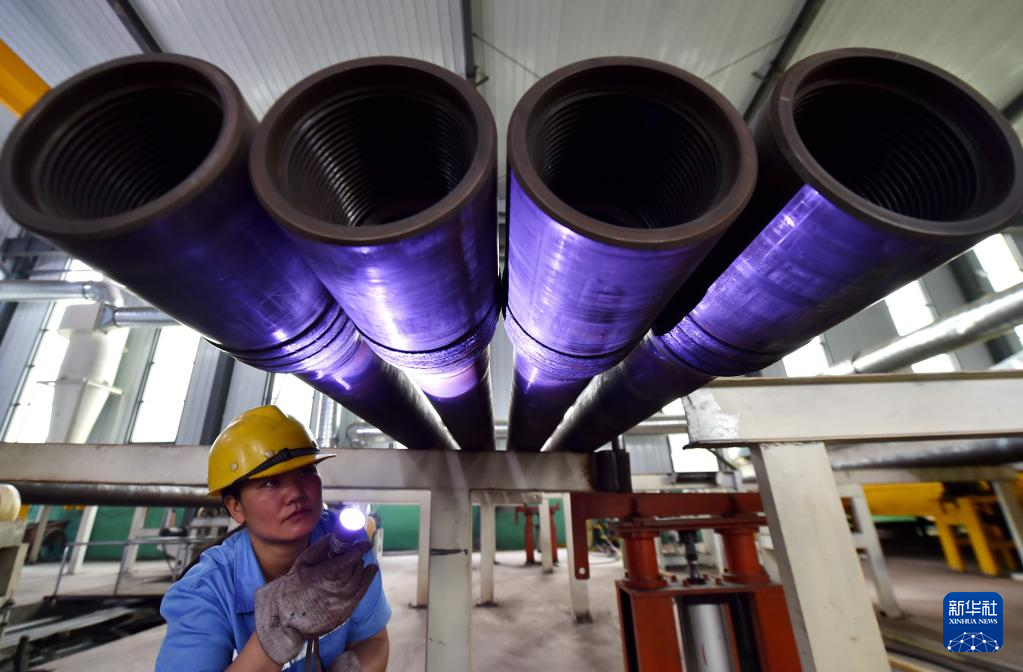 7月3日,在河北省晋州市营里镇一家地质装备生产企业,工人进行钻杆焊缝检查。