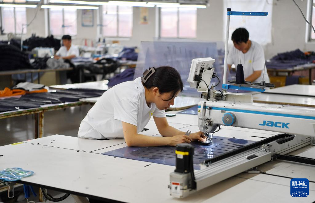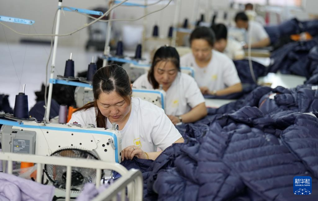 7月11日,河北省迁安市上射雁庄镇七里坎村一家服装加工企业的工人在制作羽绒服。