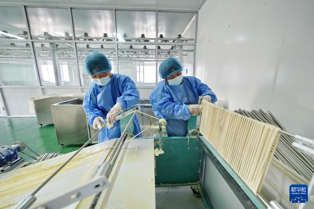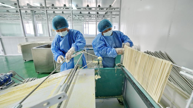 7月11日,河北省迁安市野鸡坨镇丁庄子村一家食品生产企业的工人在空心挂面生产线上工作。