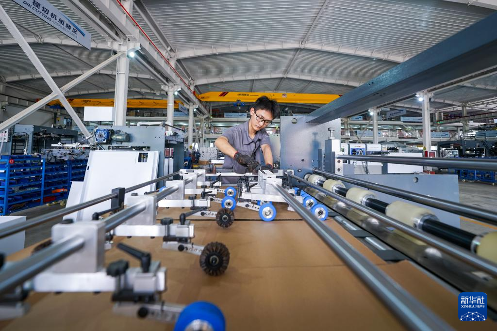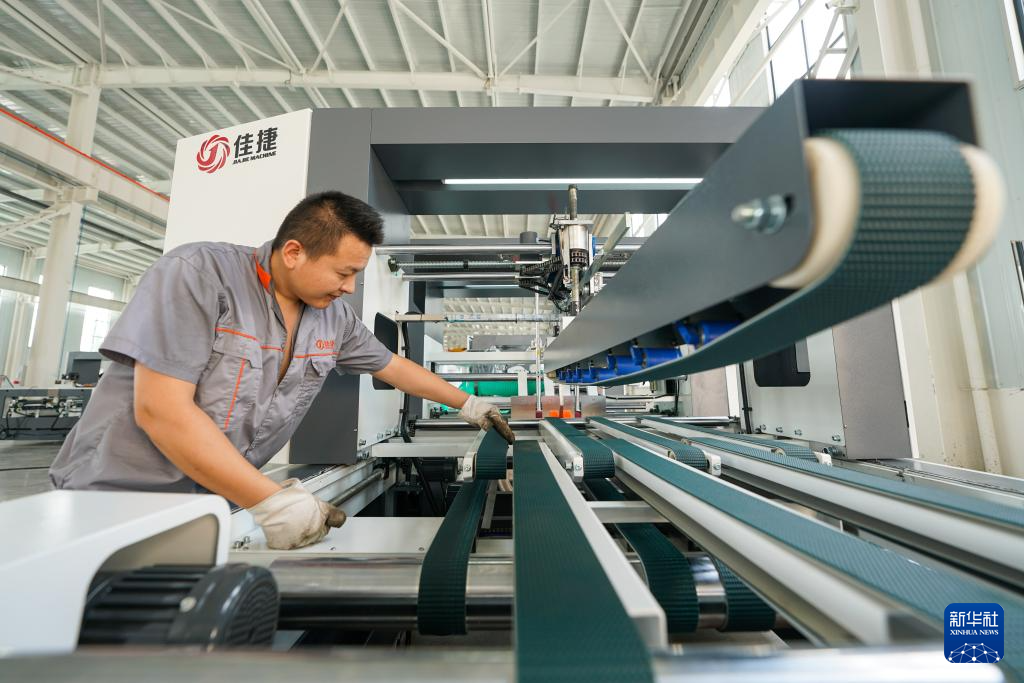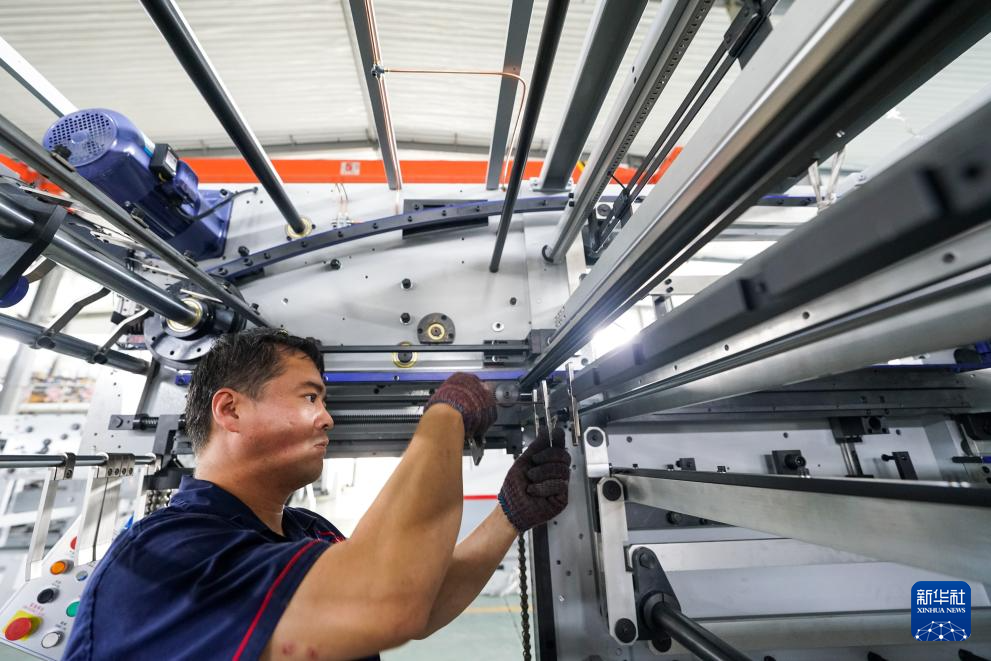 7月13日,河北省玉田县一家印刷包装机械制造企业的工人在调试产品。