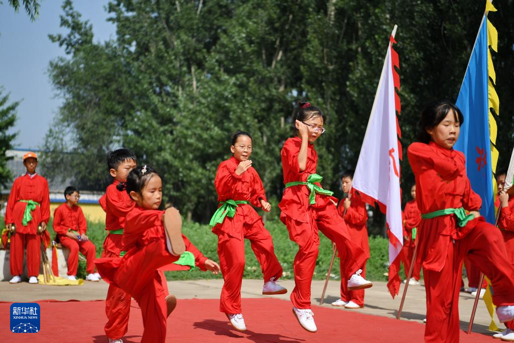 7月16日,学生在河北省涿州市刁窝镇望海庄村练习传统武术望海庄少林会。