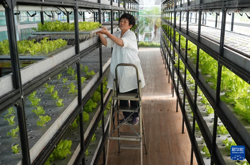 7月18日,在正定县塔元庄同福智慧农场,员工在智能温室查看立体水培蔬菜生长情况。