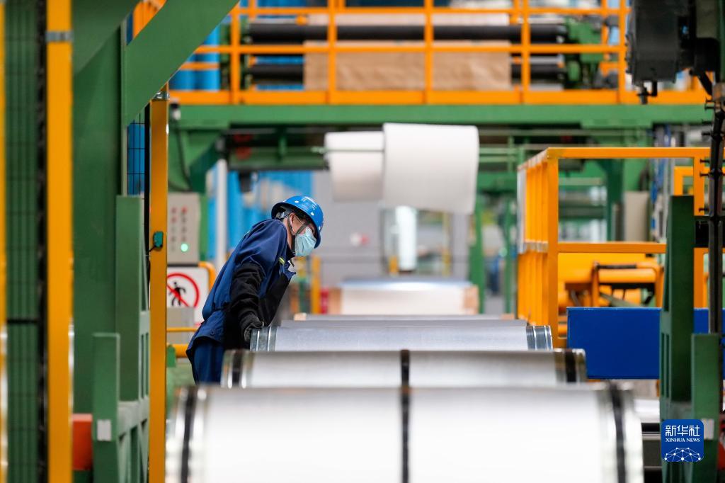 工人在首钢智新迁安电磁材料有限公司电工钢产品包装线上巡检(2023年4月19日摄)。新华社记者 牟宇 摄