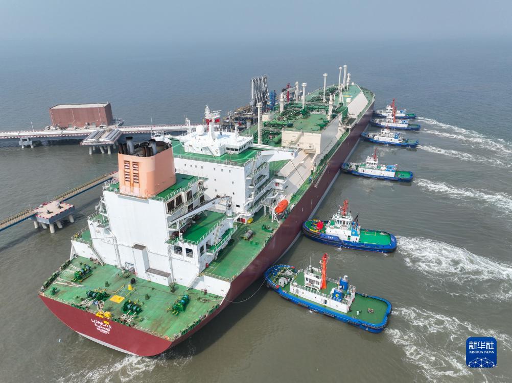 一艘LNG运输船靠泊在唐山港曹妃甸港区(2023年6月18日摄,无人机照片)。新华社发(赵亮摄)