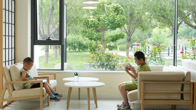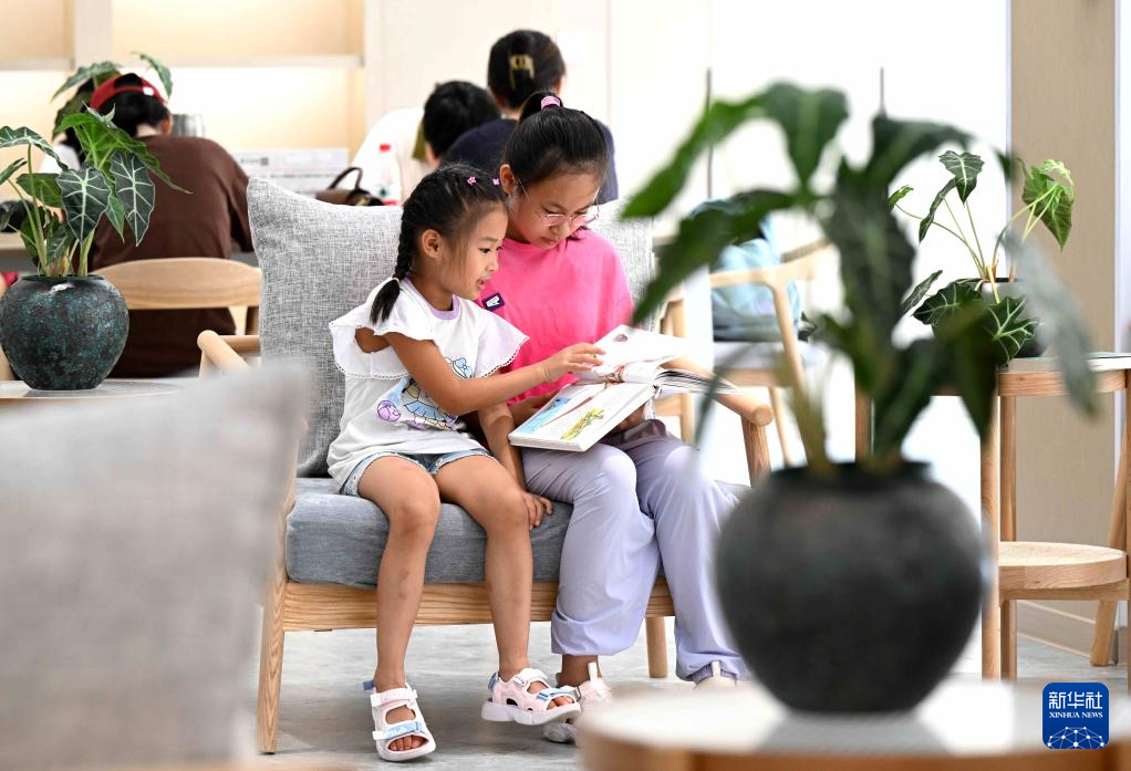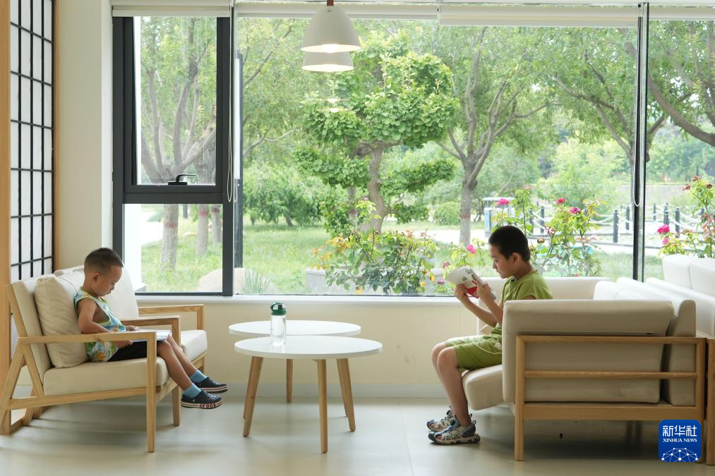 8月9日,小朋友在河北省石家庄市鹿泉区龙泉湖公园内一处公园书房阅读。
