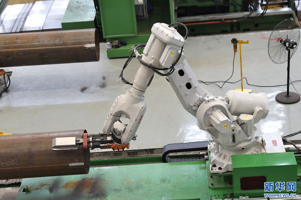 在中油宝世顺(秦皇岛)钢管有限公司的车间,自动化机器人正在进行管端焊缝修磨。新华网 魏会博摄