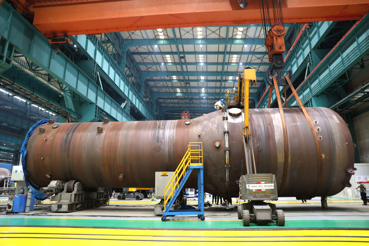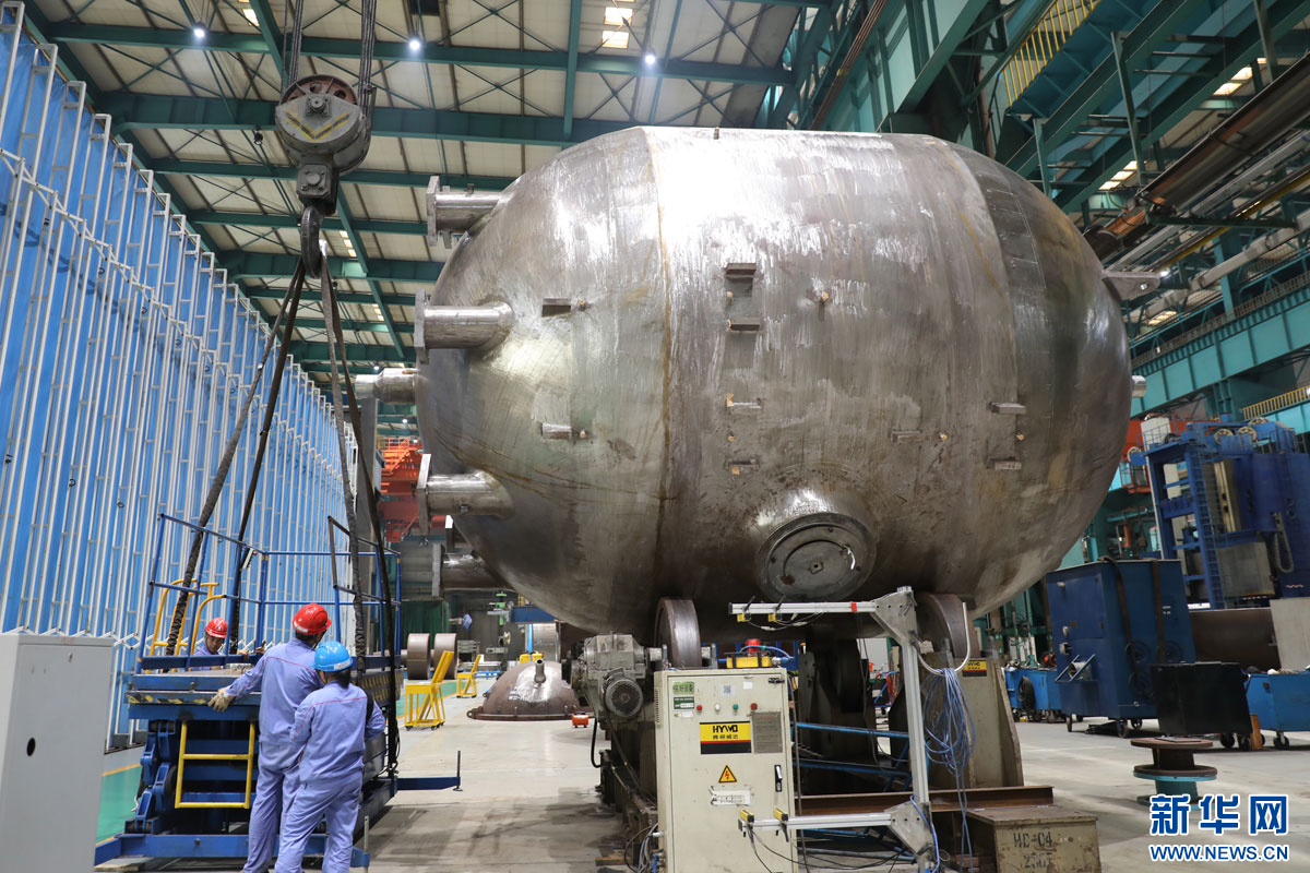 在哈电集团(秦皇岛)重型装备有限公司的车间,工作人员正在蒸汽发生器组件上方焊接作业。新华网 魏会博摄