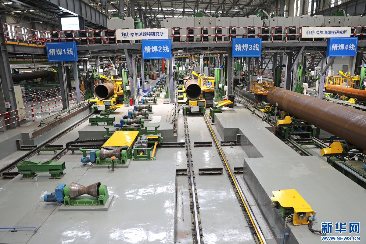 在中油宝世顺(秦皇岛)钢管有限公司的新能源焊管生产线,四条自动化焊机正在进行钢管埋弧焊接作业。新华网 魏会博摄