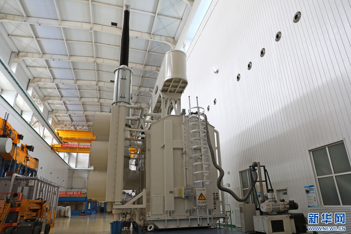 在天威保变(秦皇岛)变压器有限公司生产车间,装配完成的46万千伏安变压器正在调试。新华网 魏会博摄