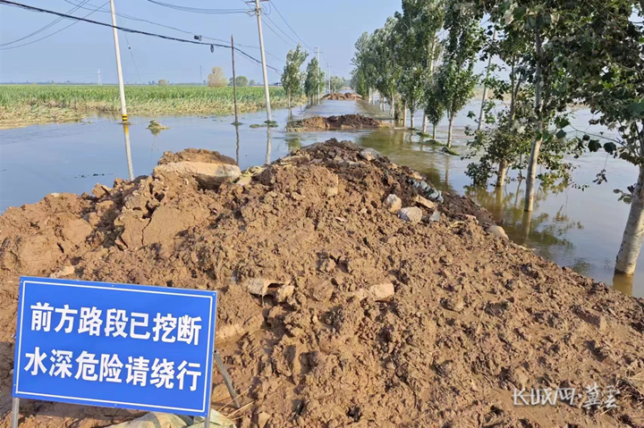 鸡泽县双塔镇村民在水毁路段设置警示标识。通讯员 秦丽萌 摄