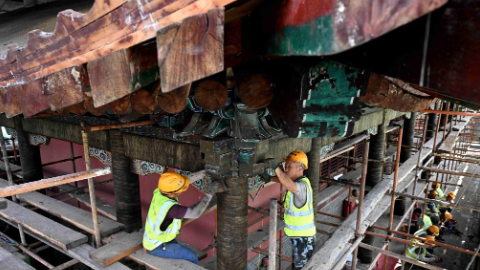 8月24日,施工人员在河北正定古城南城门楼施工现场进行修缮作业。