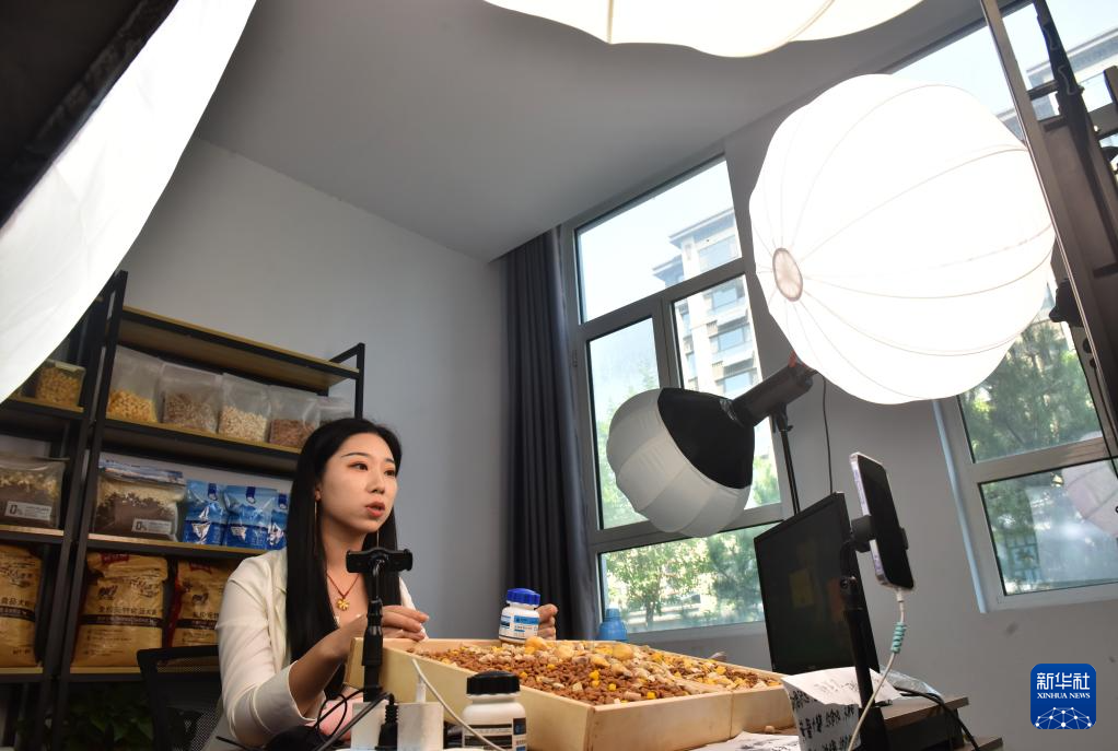 8月30日,河北省邢台市南和区和阳镇一家宠物用品生产企业工作人员通过网络直播销售产品。