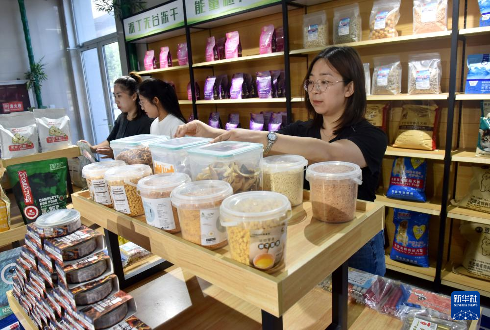 8月30日,河北省邢台市南和区和阳镇一家宠物用品生产企业工作人员在电商展厅整理货品。