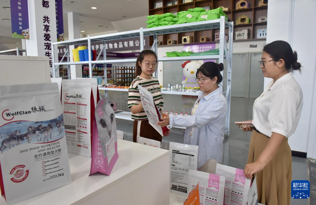 8月30日,顾客在河北省邢台市南和区贾宋镇一家宠物用品生产企业电商展厅了解产品信息。