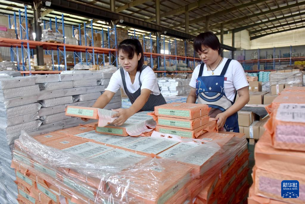 8月30日,河北省邢台市南和区和阳镇一家宠物用品电商企业工人在仓库打包产品,准备发货。
