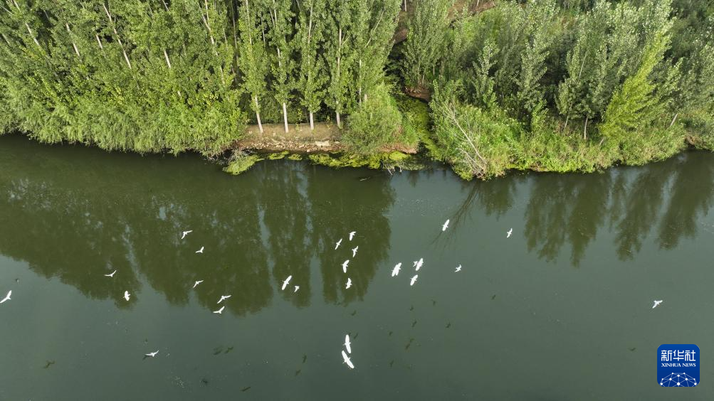 在河北省遵化市,一群白鹭在引滦入津工程重要输水河道黎河上空飞翔(9月11日摄,无人机照片)。