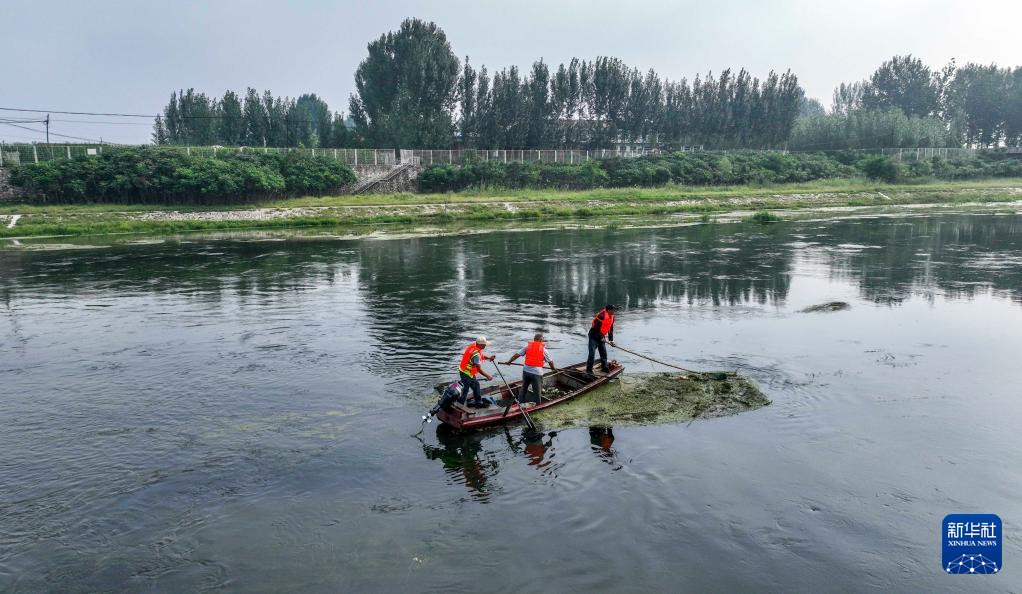 9月11日,工作人员在引滦入津工程重要输水河道河北省遵化市黎河打捞漂浮物(无人机照片)。