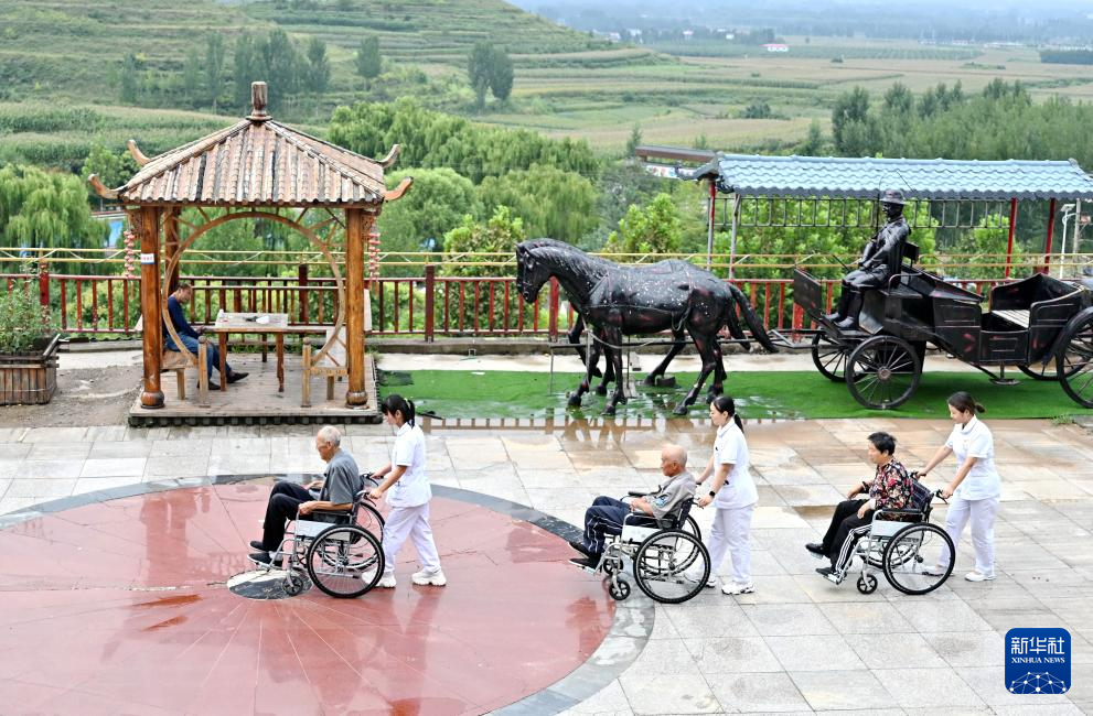 9月11日,在河北省滦州市王店子镇海洋养老中心,医务人员带领老人们在庭院中散心。