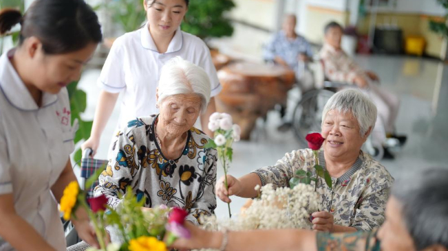 9月11日,在河北省滦州市王店子镇海洋养老中心,医务人员和老人们一起练习插花艺术。