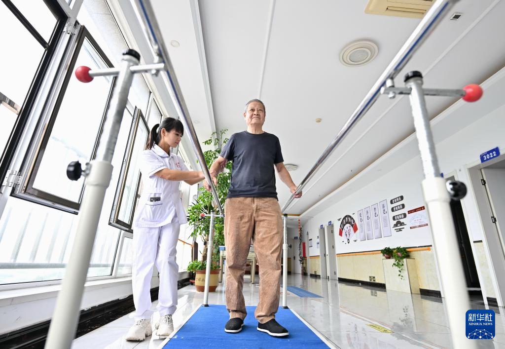 9月11日,在河北省滦州市王店子镇海洋养老中心,医务人员在指导一位老人进行康复训练。
