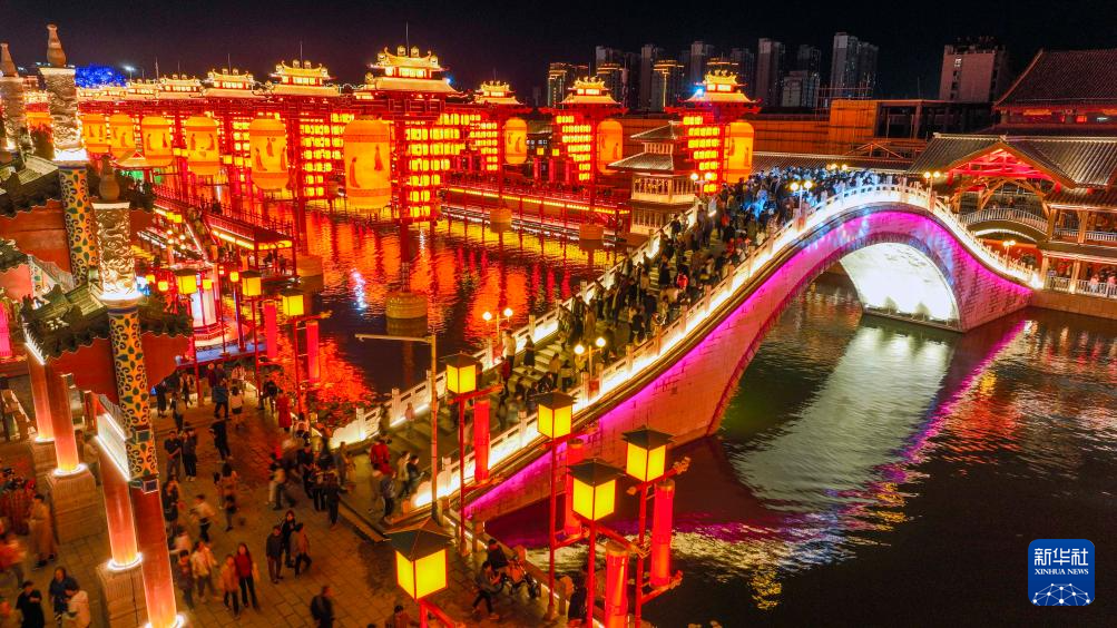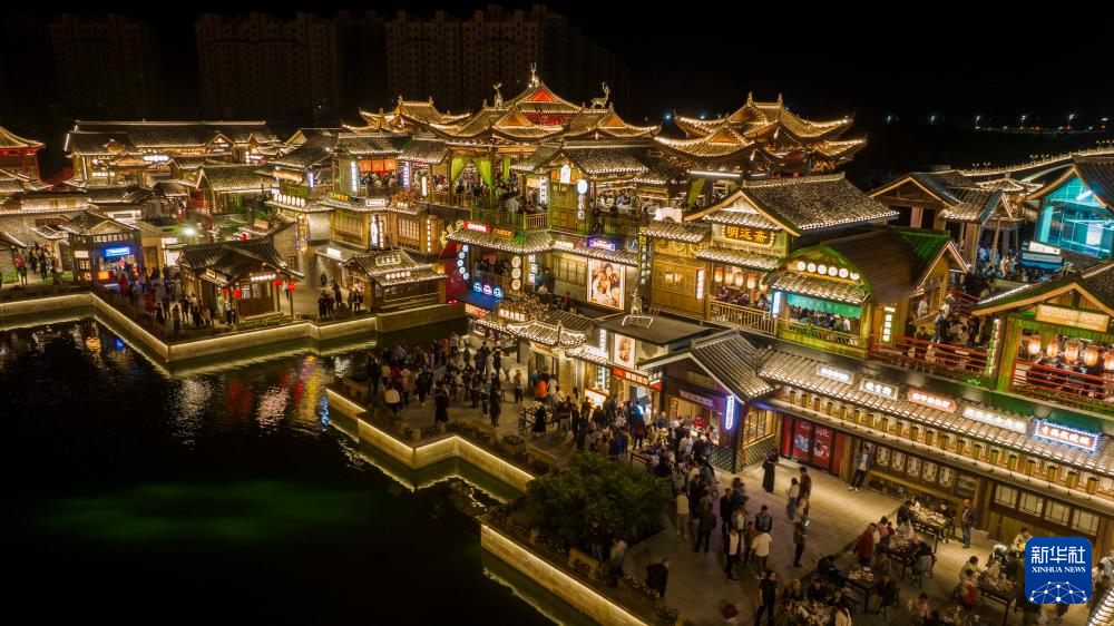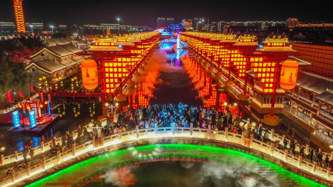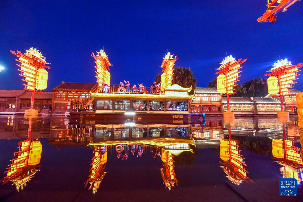 当日是国庆节,河北省唐山市丰南区河头老街景区灯光璀璨,流光溢彩,市民和游客纷纷前来赏景、游玩,欢度佳节。