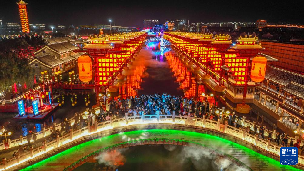10月1日,游客在唐山市丰南区河头老街赏灯游玩(无人机照片)。