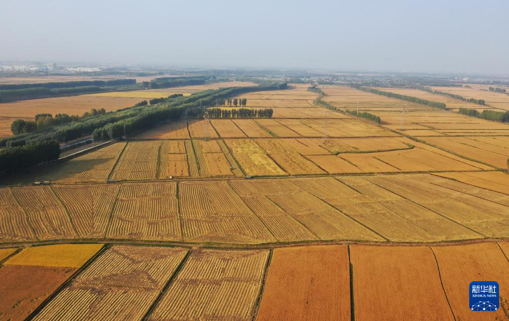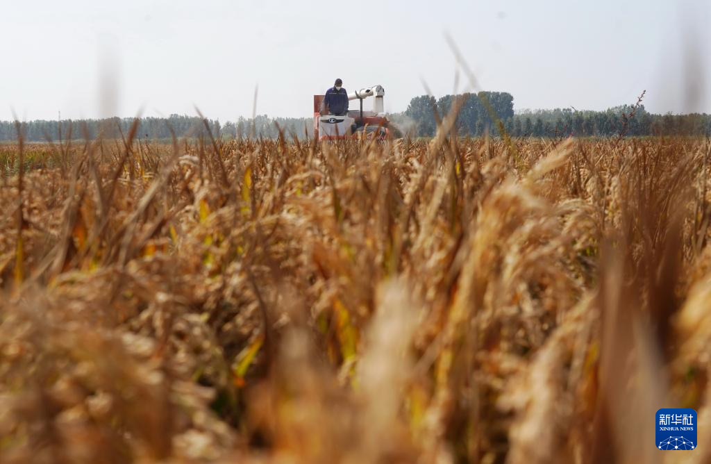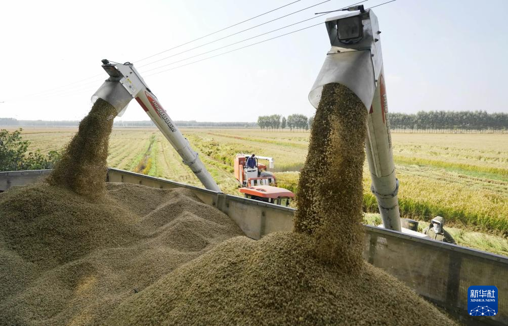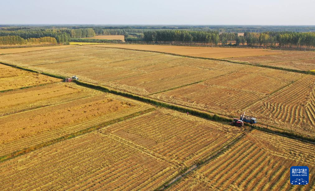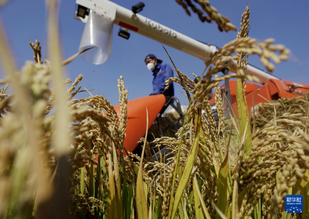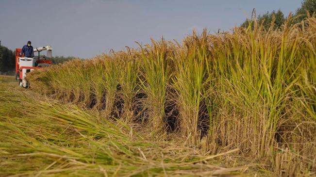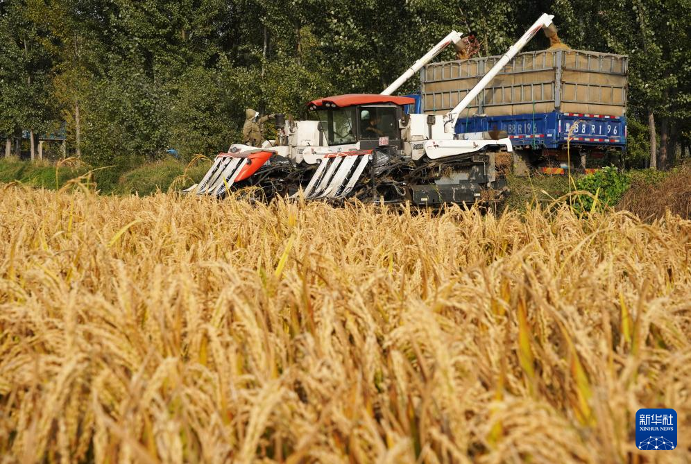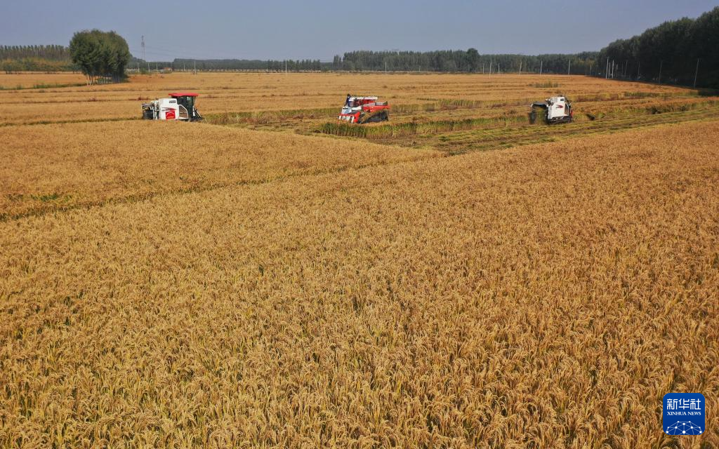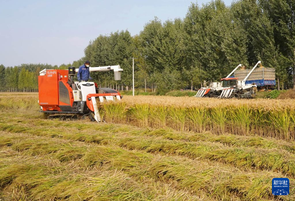 金秋时节,河北省唐山市的水稻迎来收获季节,农民开始抢抓农时适时收获,确保颗粒归仓。