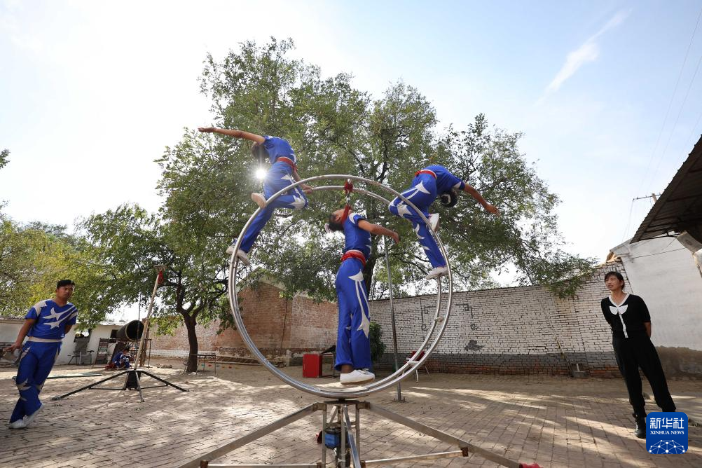 10月18日,杂技学员在河北省沧州市吴桥县铁城镇张松村一特色杂技小院练习杂技。