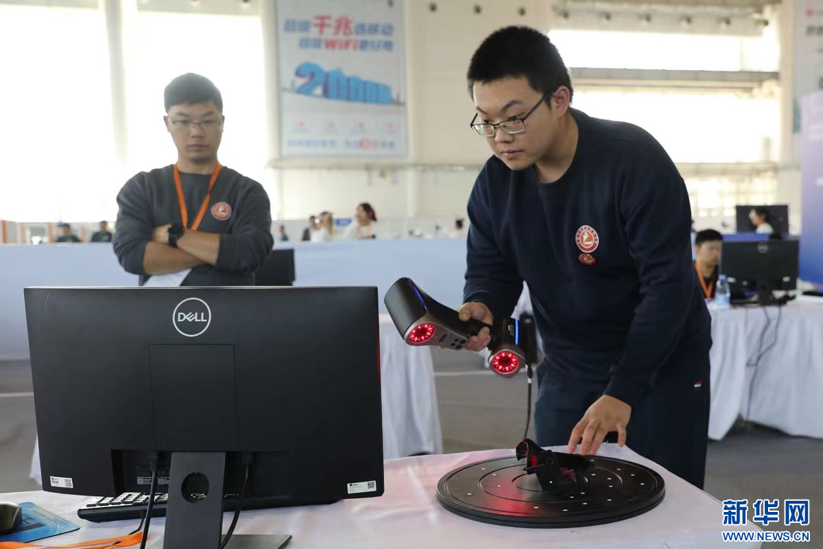 在计算机程序设计员技能比赛中,选手(右)用手持式激光扫描仪采集三维数据。新华网 魏会博摄