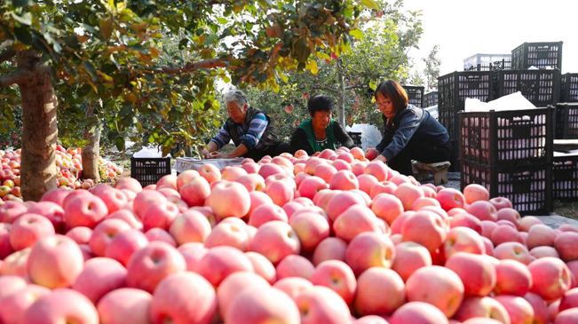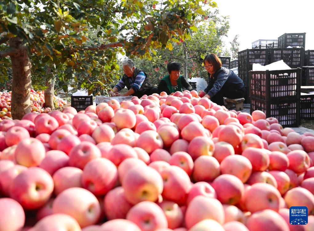 10月26日,河北顺平县南神南村果农在果园分拣采摘的苹果。