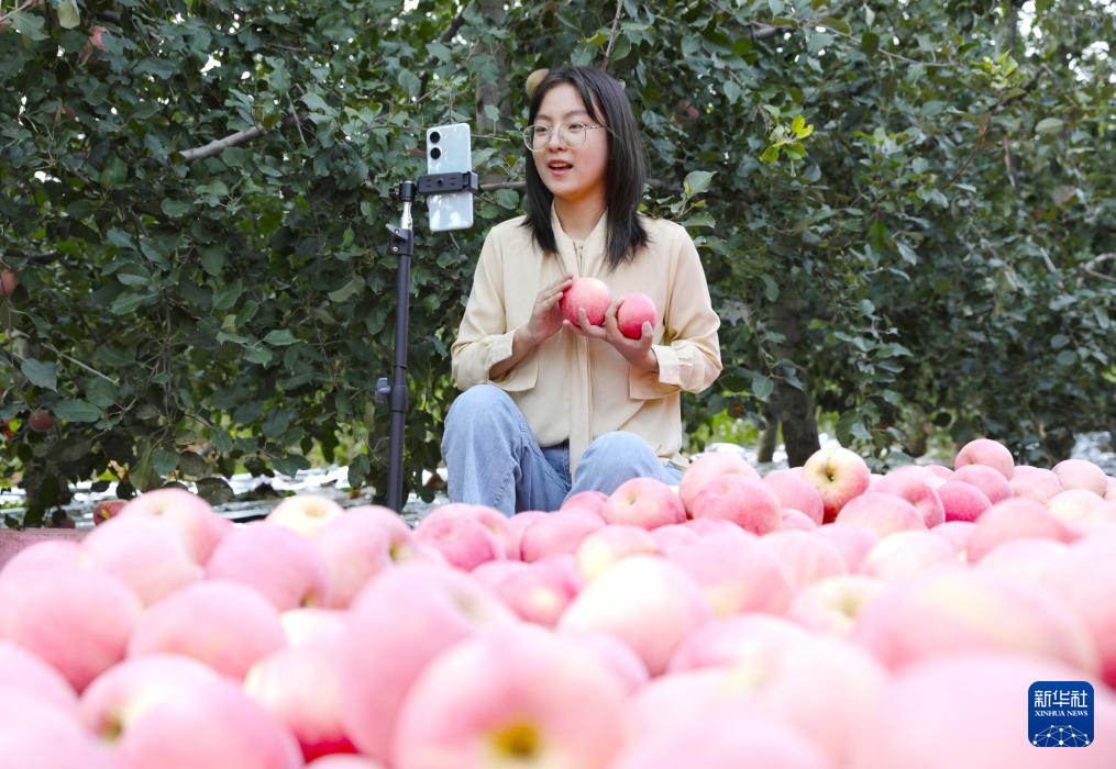 10月26日,在河北顺平县南神南村果园,一名主播通过网络直播推销苹果。