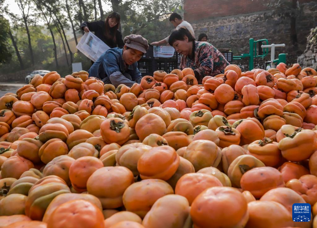 10月29日,农民在遵化市一家水果专业合作社场院分拣收购的柿子,准备装箱外运。