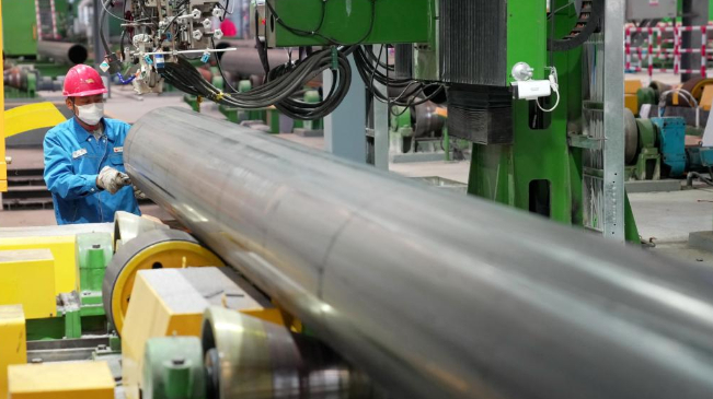11月5日,工人在秦皇岛经济技术开发区中石油宝世顺(秦皇岛)钢管有限公司钢管生产线上工作。