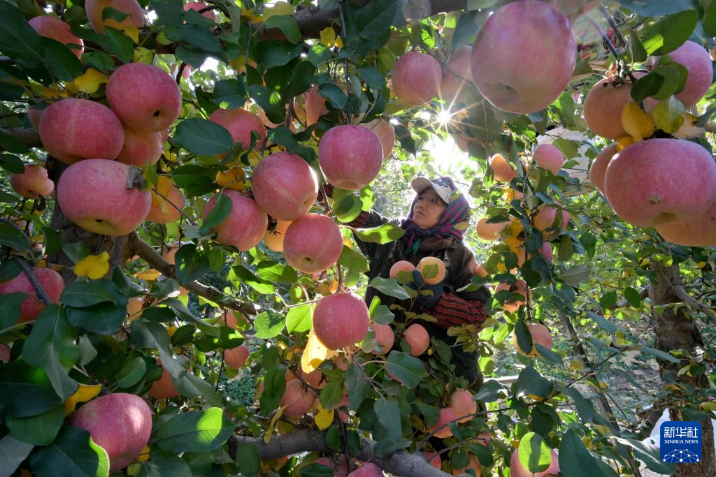 11月7日,在河北省滦州市王店子镇卧龙谷生态农业科技园区,果农在采摘苹果。