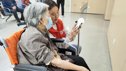 这样温馨的场景,每天都在医院发生,穿着蓝马甲、红马甲或带绶带的志愿者们,站在医院大门口、急诊、门诊楼为患者提供指引路线、推轮椅、打印报告、办理预约等各类服务,他们用细致、耐心的服务,温暖着一个个就诊患者和家属,成为医院一道靓丽的风景线。