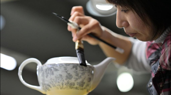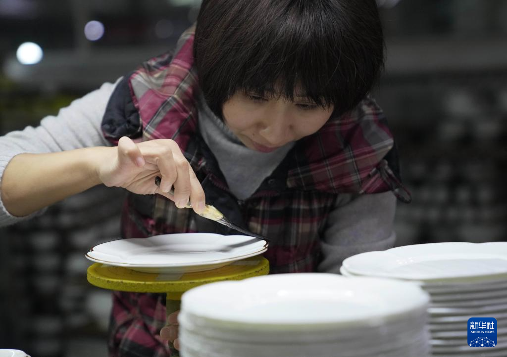 12月15日,工人在河北省唐山市开平区一家日用陶瓷企业的贴花描金车间工作。