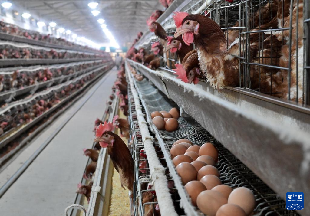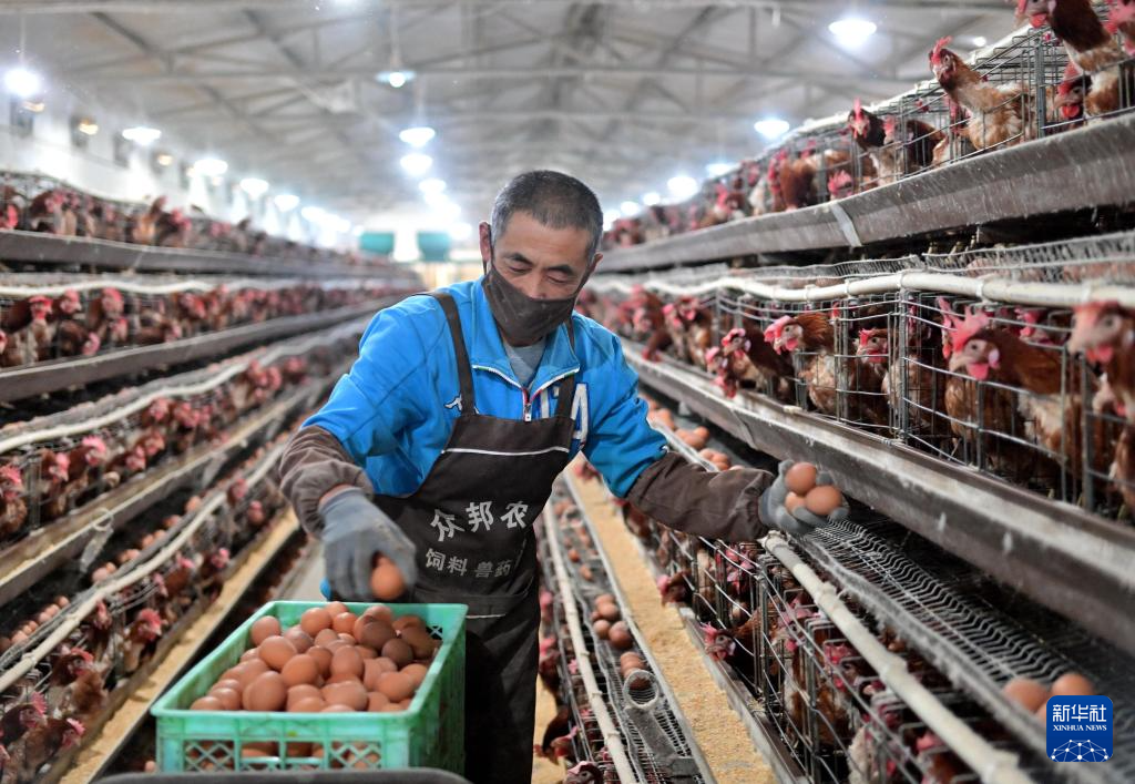 12月16日,河北省滦州市滦城街道办事处后明碑村一家蛋鸡养殖合作社的社员在鸡舍内捡拾鸡蛋。
