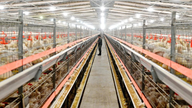 12月16日,河北省滦州市滦城街道办事处杨家院村一家肉鸡养殖合作社的社员在鸡舍内工作。
