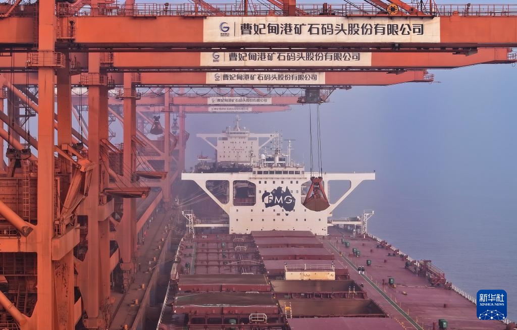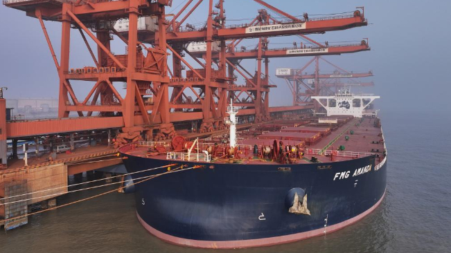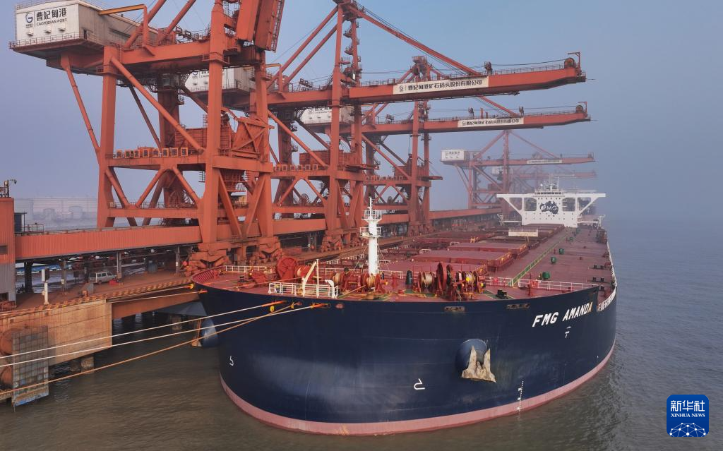 2月7日,一艘轮船靠泊在唐山港曹妃甸港区矿石码头卸载(无人机照片)。