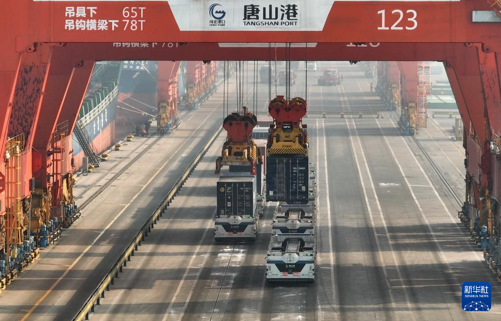 2月7日,在唐山港京唐港区集装箱码头,无人驾驶集装箱卡车在运送集装箱(无人机照片)。