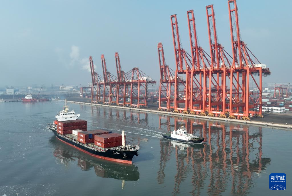 2月7日,一艘轮船在唐山港京唐港区集装箱码头装完货物后离港(无人机照片)。