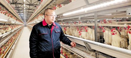 2月10日,河北九鑫牧业有限公司董事长周庆施查看20万套父母代种鸡饲养情况。河北日报记者 解楚楚摄