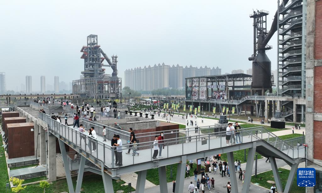 4月27日,市民在河北省石家庄市工业遗址公园游览(无人机照片)。