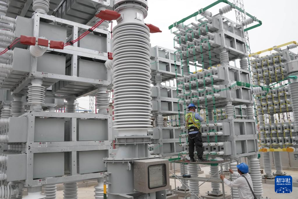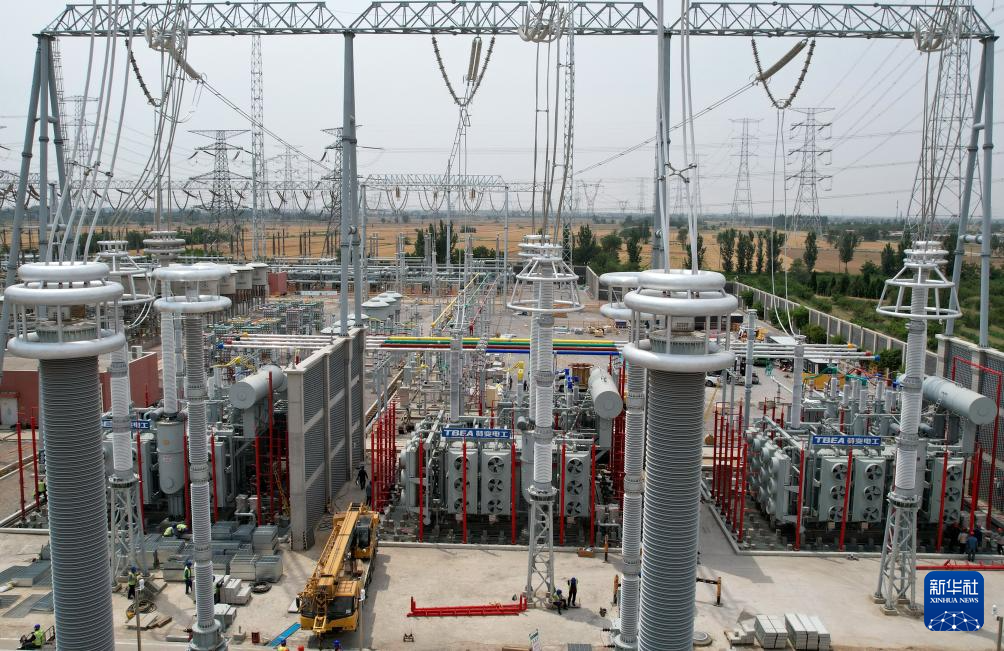 6月4日,工人在位于河北省新河县境内的榆横至潍坊1000千伏特高压交流输变电工程邢台变电站扩容工程建设工地施工。
