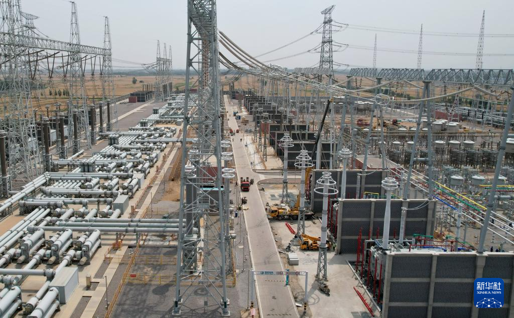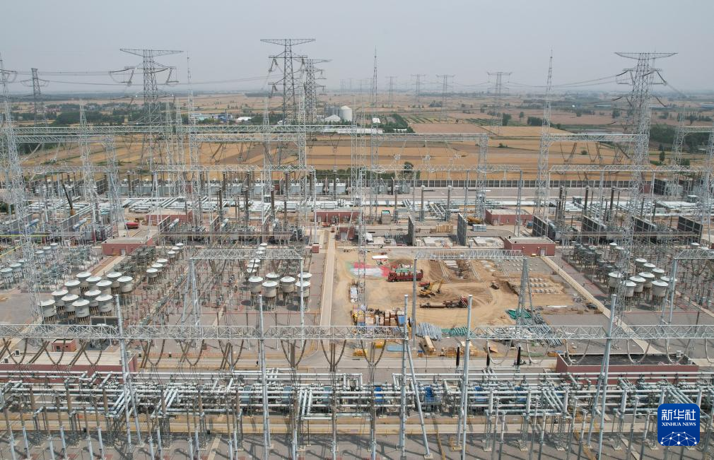 6月4日,工人在位于河北省新河县境内的榆横至潍坊1000千伏特高压交流输变电工程邢台变电站扩容工程建设工地施工(无人机照片)。