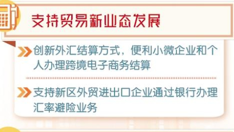 支持贸易新业态发展。创新外汇结算方式,便利小微企业和个人办理跨境电子商务结算;支持新区外贸进出口企业通过银行办理汇率避险业务,并对企业进行一定支持等。
