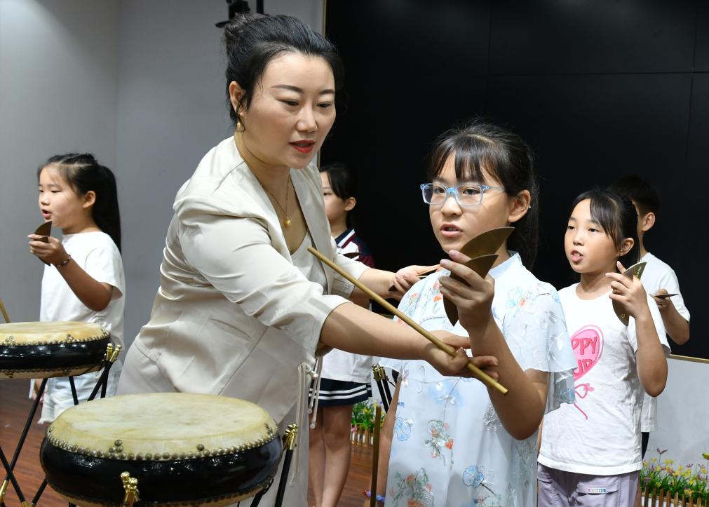 7月26日,在河间市第一实验小学,西河大鼓艺人指导学生学习西河大鼓。
